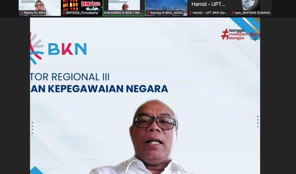 Bandung – Dalam rangka mendukung pelaksanaan kebijakan nasional Profiling ASN (ProASN) yang digagas Badan Kepegawaian Negara (BKN), Kantor Regional III BKN Bandung menggelar Rapat Persiapan Profiling ASN secara daring melalui