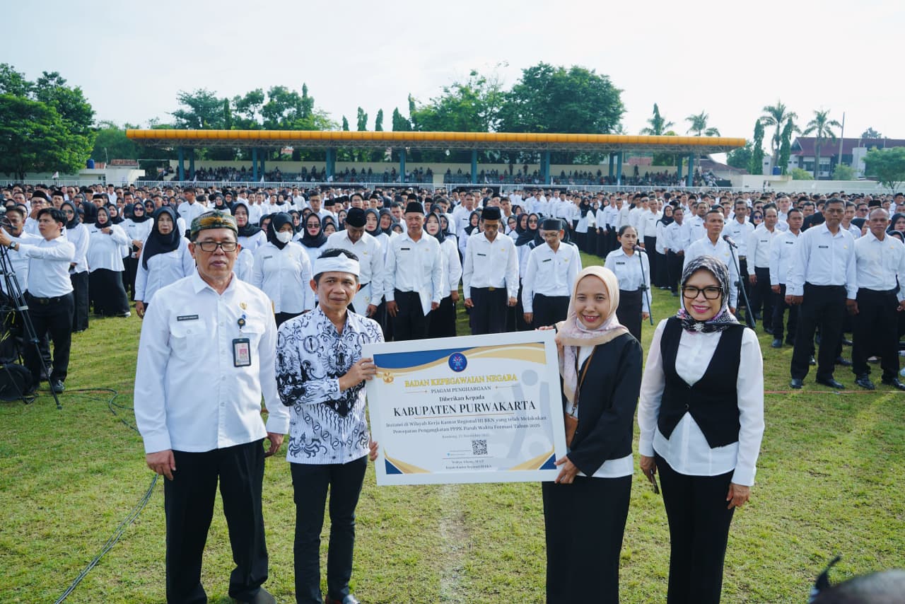 Penghargaan tersebut diberikan karena Pemkab Purwakarta dinilai konsisten dan progresif dalam menyelesaikan penataan tenaga Non ASN, mulai dari proses perencanaan formasi, seleksi hingga tahapan penerbitan SK. Dalam sambutannya, Bupati Purwakarta, Saepul Bahri Binzein menyampaikan terima kasih kepada BKN dan seluruh pihak yang telah bekerja sama dalam penyelesaian Non ASN. Ia menegaskan bahwa pengangkatan PPPK Paruh Waktu bukan sekadar administrasi, tetapi amanah yang mengikat sekaligus bagian dari reformasi birokrasi untuk mewujudkan pelayanan publik yang semakin profesional.